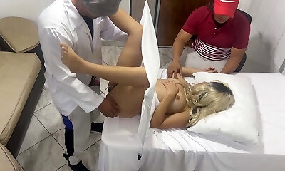 Perv Poses as a Gynecologist Therapist to Pummel the Beautiful Wife Next to Her Dumb Husband in an Erotic Medical Consultation