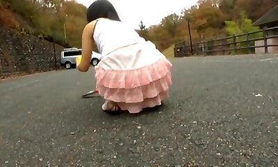 Asian teenage bends over and flashes horny upskirt in the street